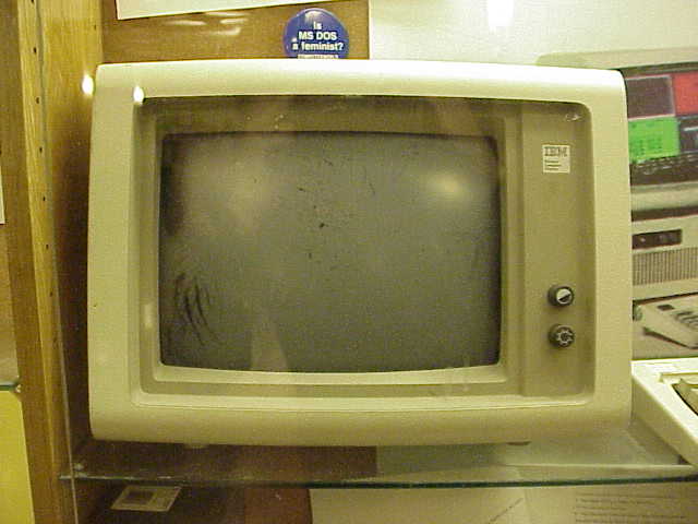 IBM PC (display under construction) IBM announced its entry into the personal computer market in 1980>. Standard models had 64K of memory and one or two drives for floppy disks (A,B) of 360K each. Memory capacity could be increased to 640K. Memory addresses above 640K were dedicated to special functions, as the display. The standard, black and white display tube, as shown, required about yy K for its 640 by 480 pixel display. Standard characters of 8 by 12 pixels allowed displaying 40 lines of 80 characters each. Later models provided a 10 Megabyte hard disk (C), replacing one of the floppy drives. |